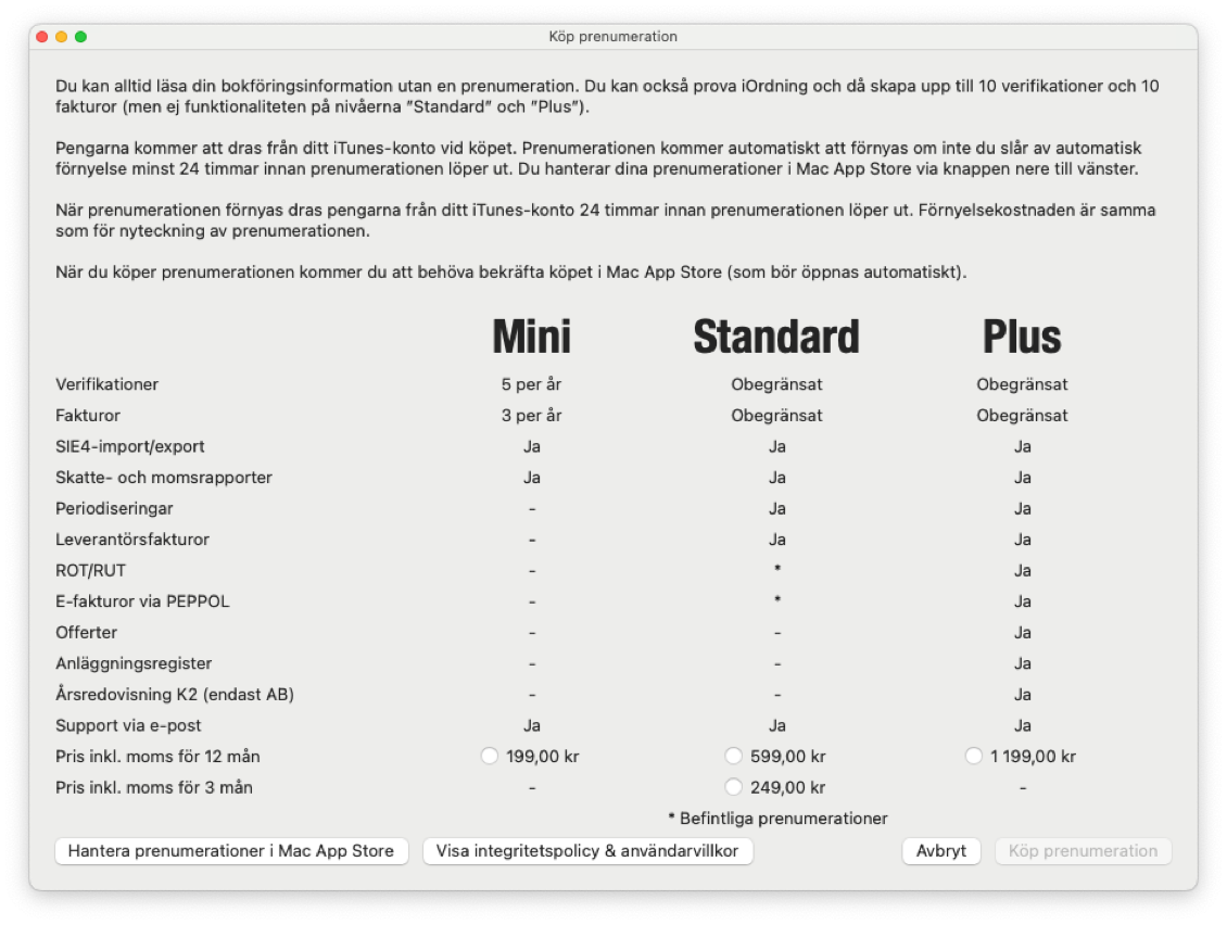 iOrdning är gratis att hämta ner från Mac App Store. Det finns tre olika prenumerationsnivåer: